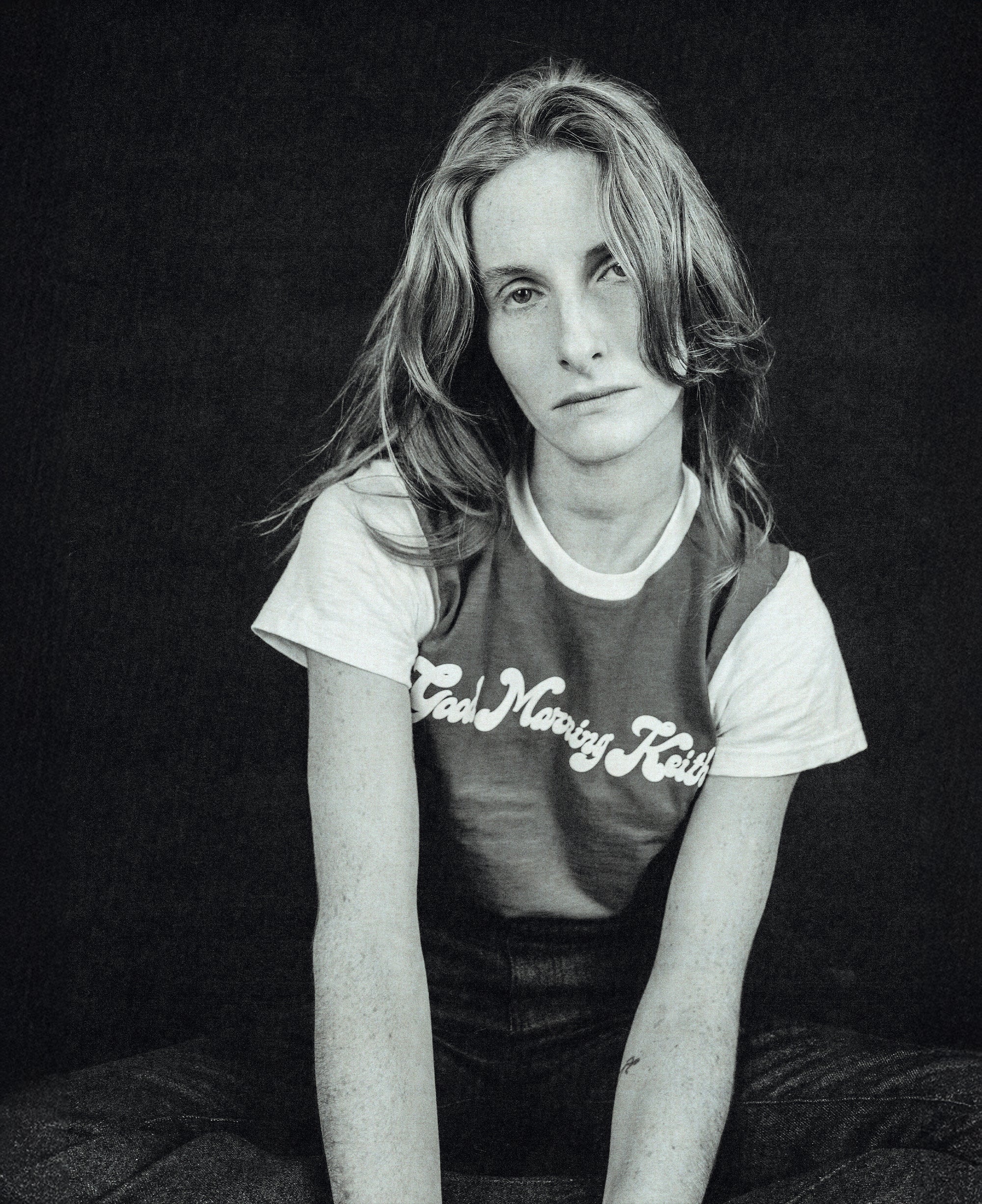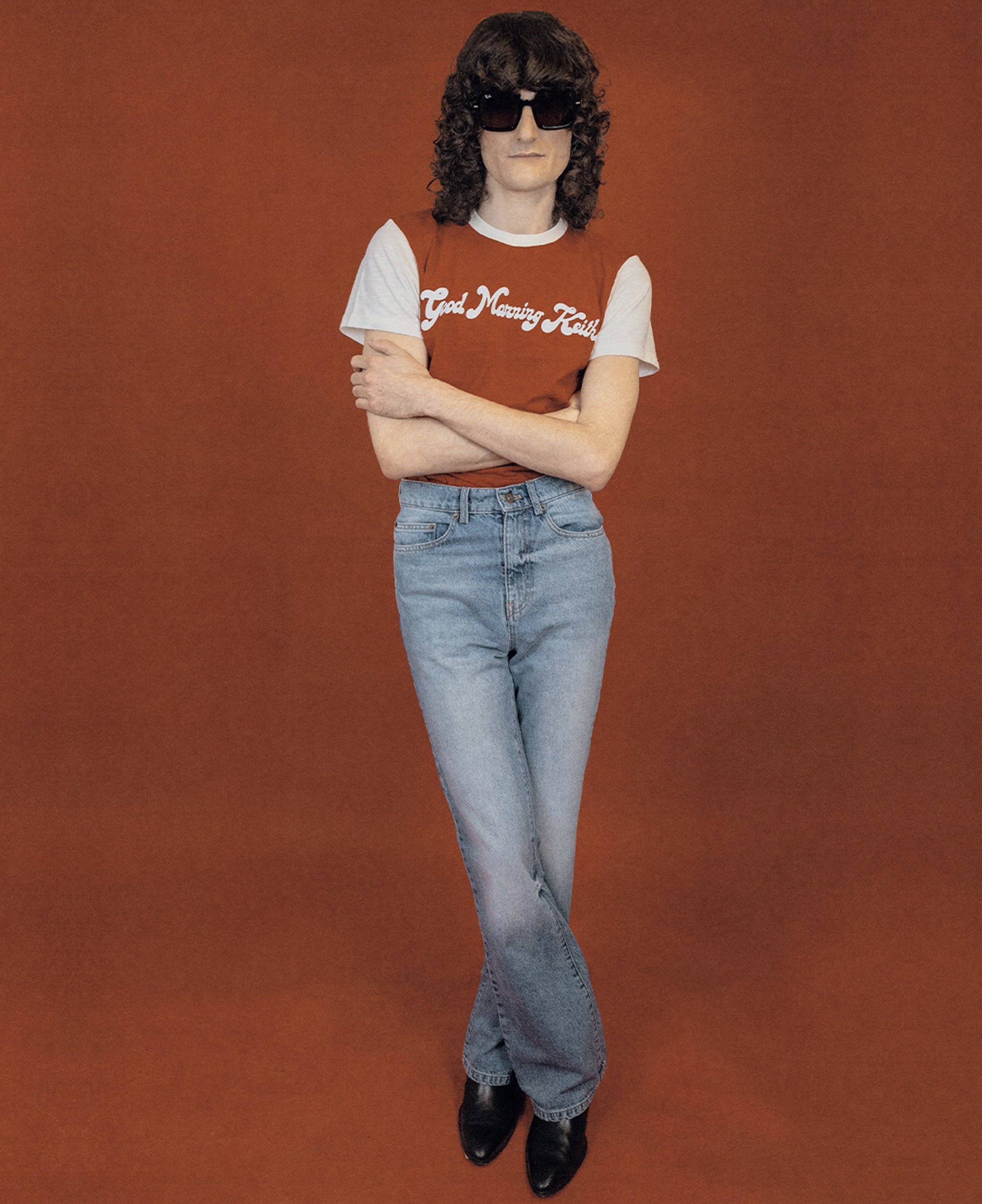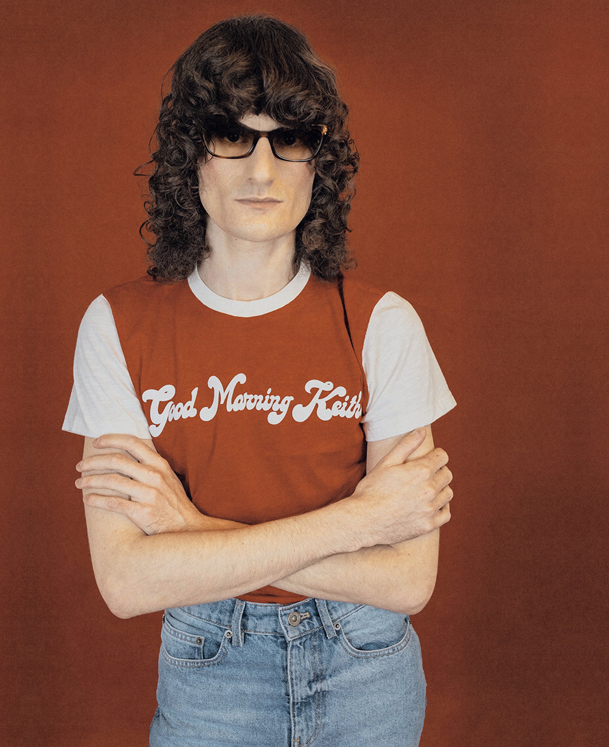 Iconic unisex red ringer t-shirt with short sleeves and rounded collar, Good Morning Keith flocked in Paris.
