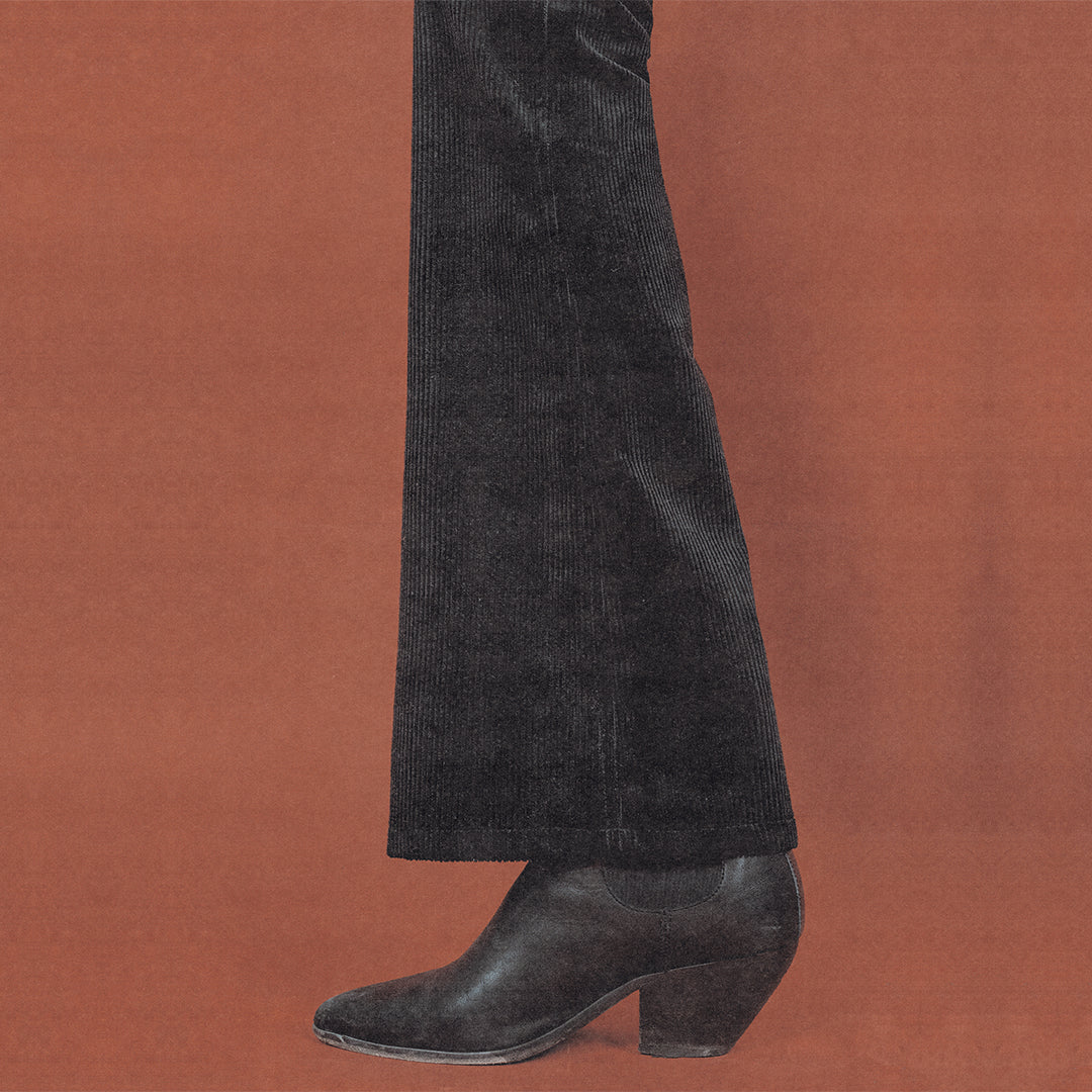 Iconic high-waisted 5 pockets unisex flare jeans made of black corduroy cotton with rivets on the front pockets. All the processes of design, sourcing, and production are made in Paris.
