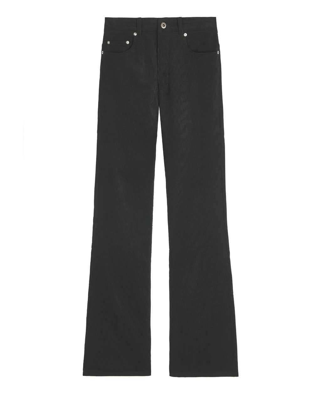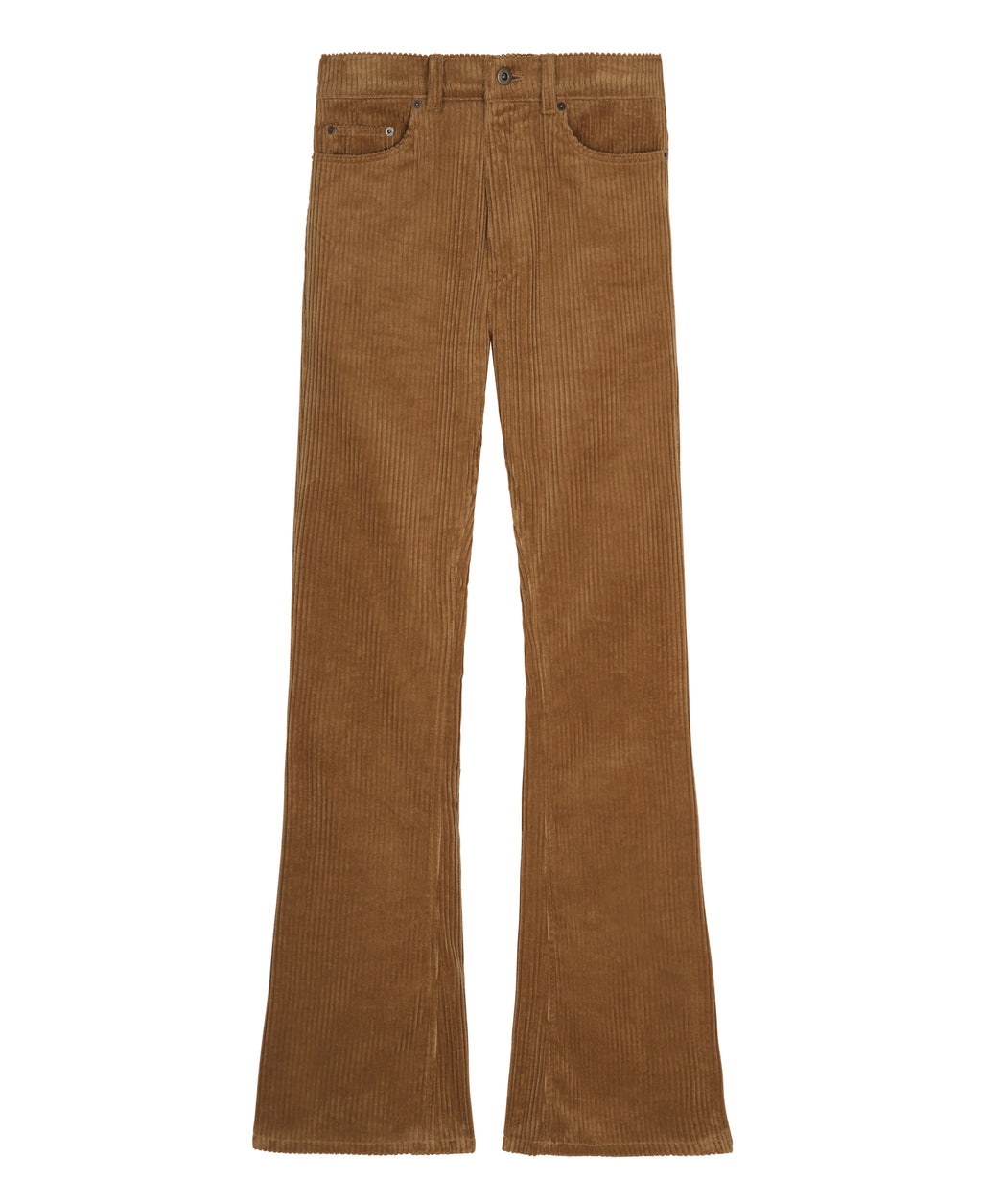 Iconic high-waisted 5 pockets unisex flare jeans made of brown corduroy cotton with rivets on the front pockets. All the processes of design, sourcing, and production are made in Paris.