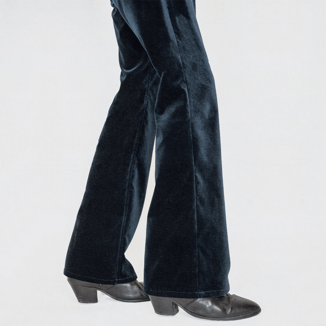 Iconic high-waisted 5 pockets unisex flare jeans made of a midnight blue velvet fabric with rivets on the front pockets.All the processes of design, sourcing, and production are made in Paris.