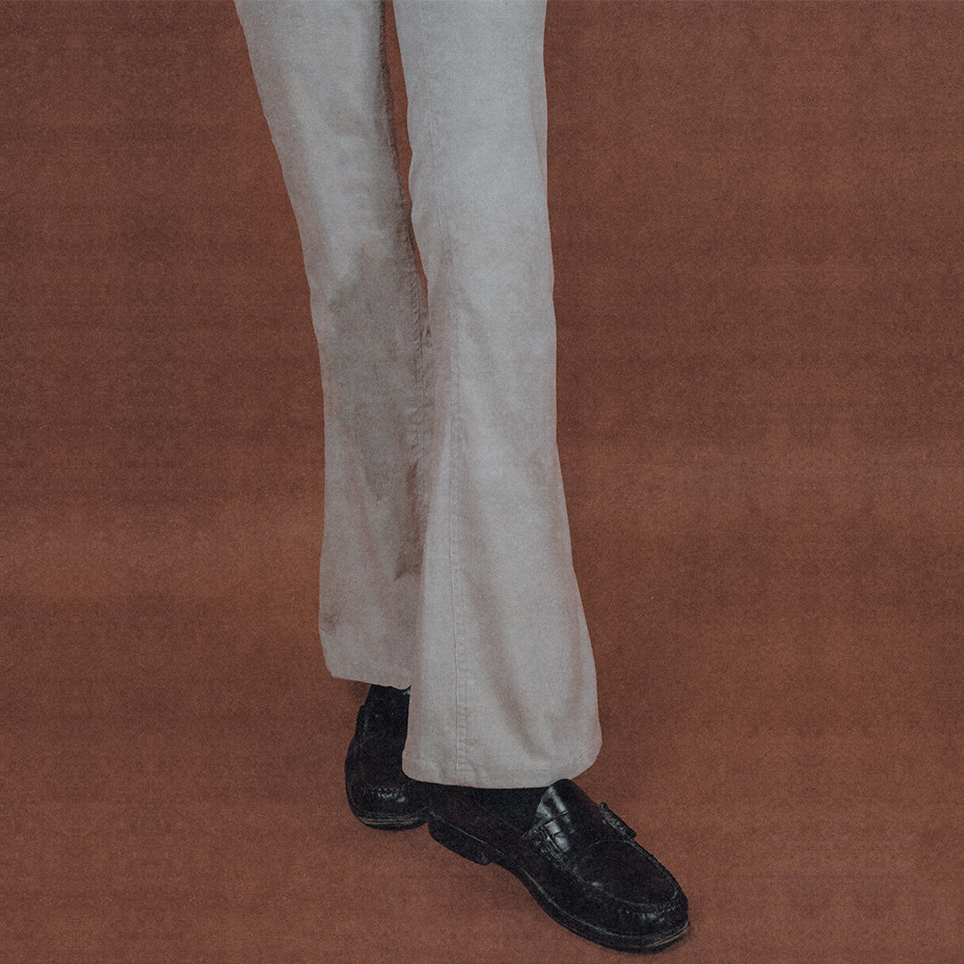 Iconic high-waisted 5 pockets unisex flare jeans made of sand corduroy cotton with rivets on the front pockets. All the processes of design, sourcing, and production are made in Paris.