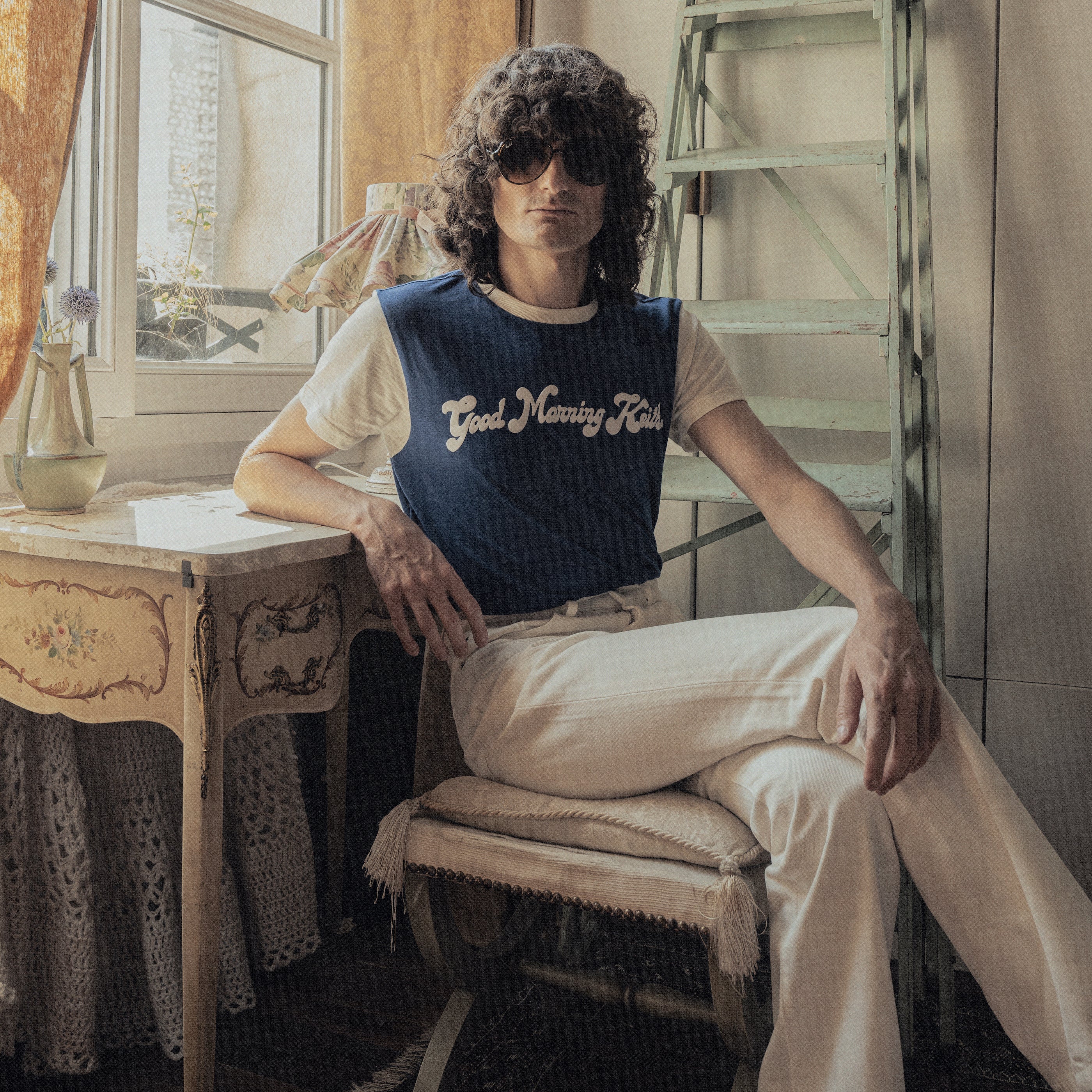 Iconic unisex blue ringer t-shirt with short sleeves and rounded collar, Good Morning Keith flocked in Paris.
