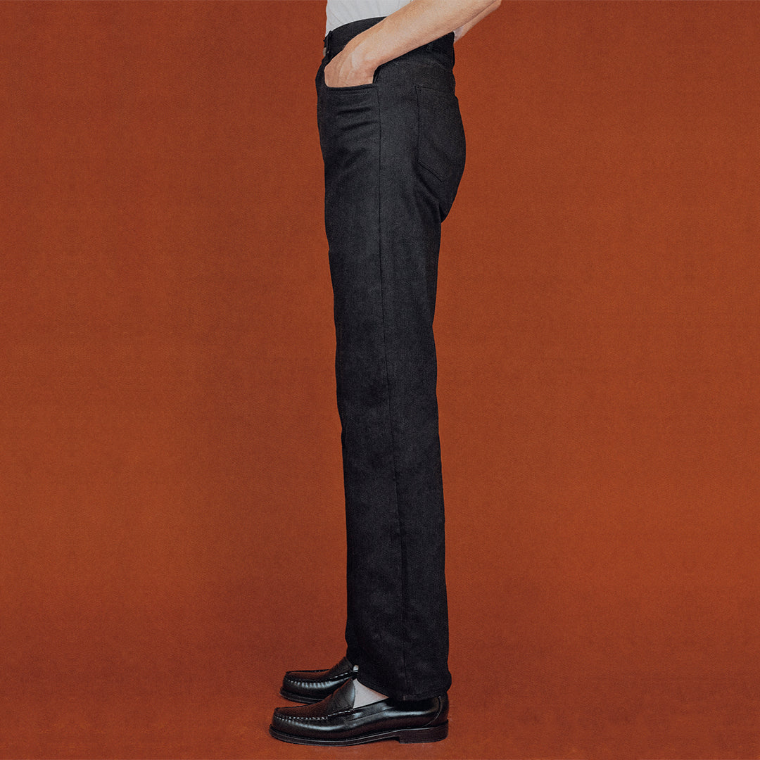 Iconic mid-high-waisted 5 pockets unisex straight jeans made of black cotton denim with rivets on the front pocketsAll the processes of design, sourcing, and production are made in Paris. We have recently acquired a lovely deadstock from Tunisia, where we locally manufactured the fabric we just found.