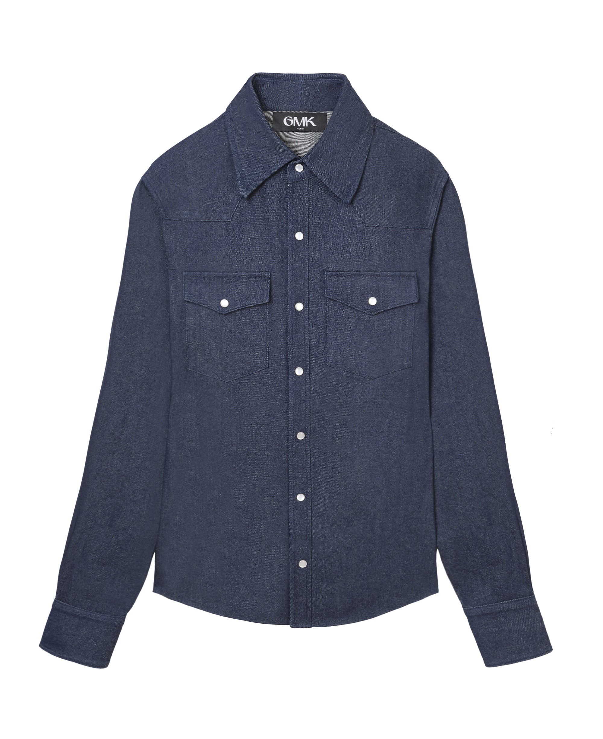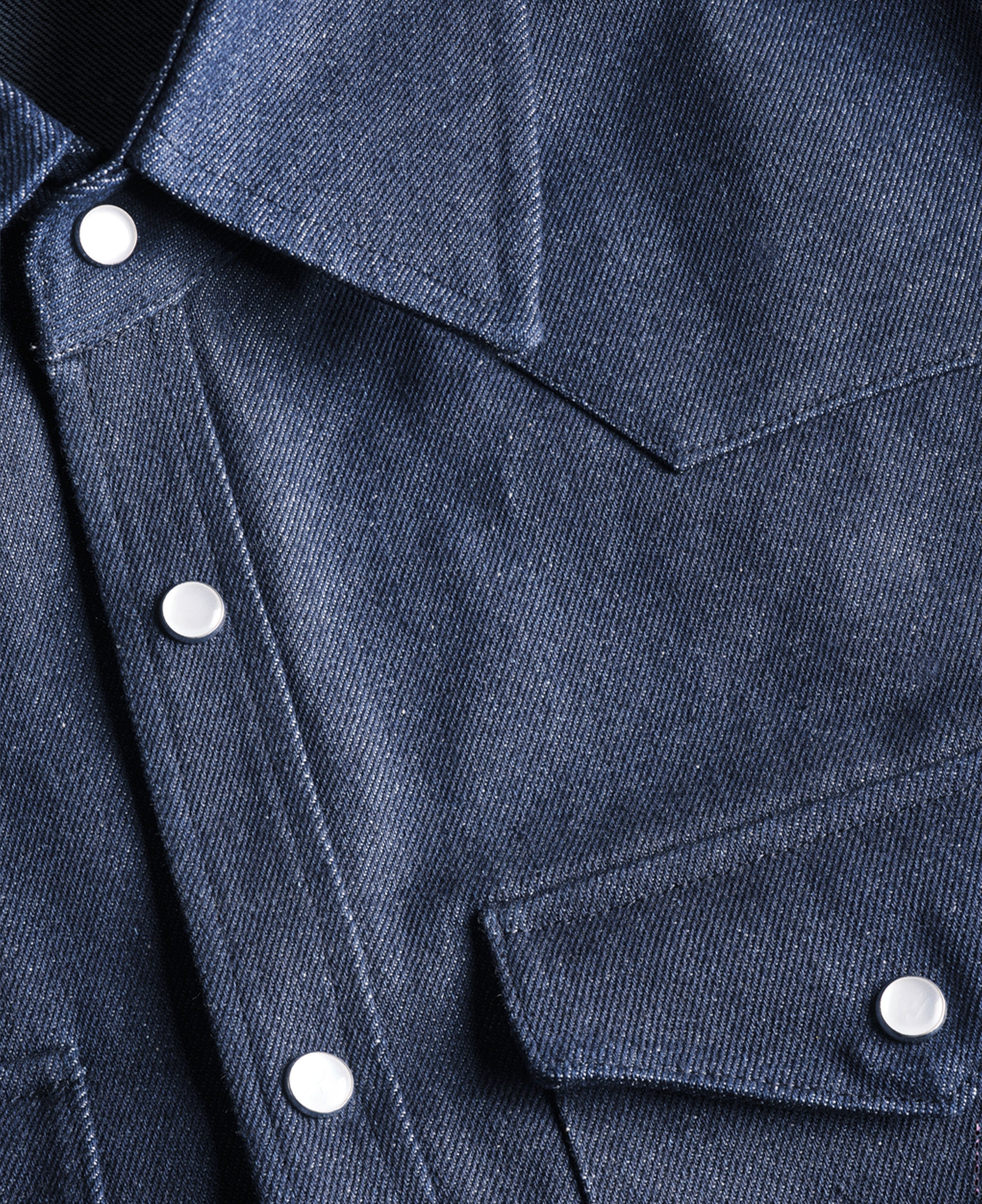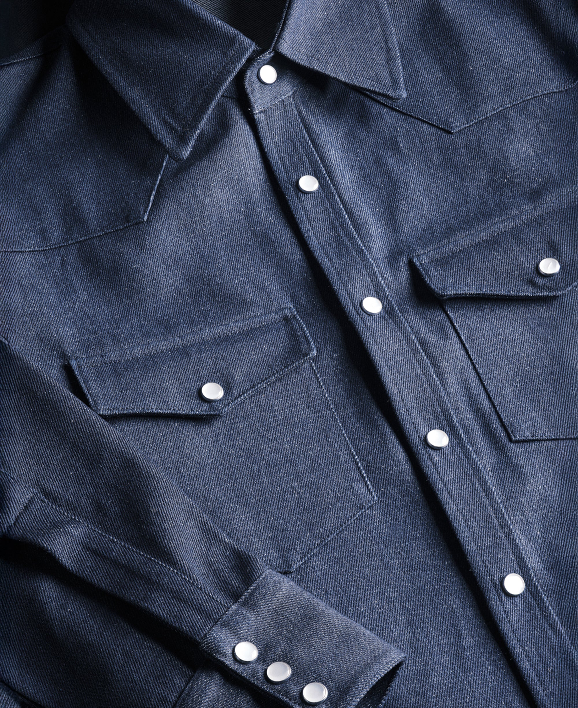 Iconic unisex western shirt with long sleeves, 70's collar, 2 flap pockets with snap buttons on the chest, buttoned cuff, western yoke and 7 snap buttons.